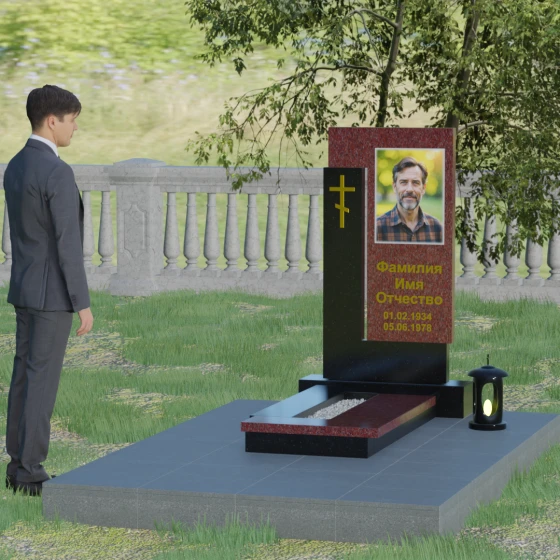 Данная модель выделяется своей сложной, архитектурно выверенной асимметрией. Основная вертикальная стела, выполненная из глубокого черного камня, дополнена массивным Г-образным элементом, который словно обнимает центральную часть, создавая защитный контур. Геометрия изделия строгая и лаконичная: прямые углы и четкие фаски подчеркивают монументальность конструкции. Особое внимание уделено игре фактур: идеально гладкая, зеркальная полировка лицевых граней контрастирует с архитектурной сложностью сочленения двух блоков.