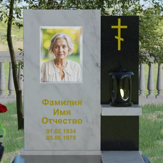 Представленная модель отличается изысканной асимметрией и сложной геометрией, где две вертикальные стелы разной высоты сливаются в единый гармоничный ансамбль. Левая часть, более высокая и массивная, имеет плавный дугообразный срез в верхней части. Этот мягкий изгиб символизирует бесконечность жизненного пути и обретенный вечный покой, смягчая строгость натурального камня. На этой панели располагается портрет и основная информация, выполненная глубокой гравировкой с золочением. Правая часть композиции, выполненная из контрастного камня, служит духовным акцентом: на ней закреплен лаконичный православный крест, сияющий золотом, что подчеркивает веру и надежду на вечную жизнь.
