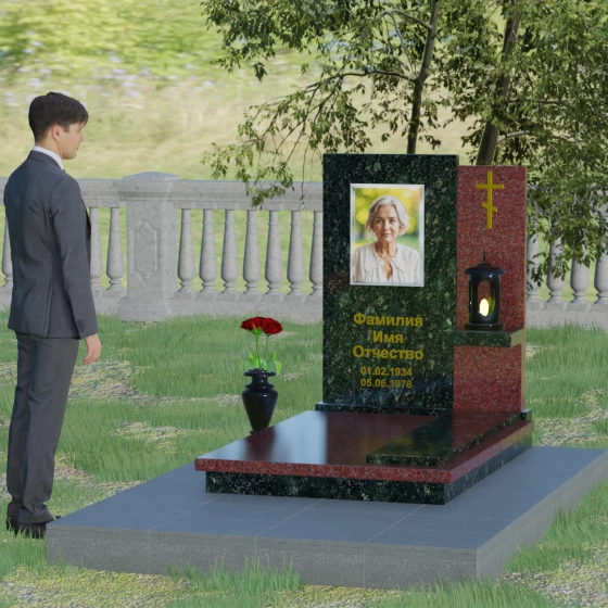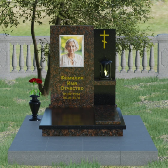 Кому подойдет: Данная модель является универсальной благодаря своему лаконичному и одновременно глубокому дизайну. Она станет достойным выбором как для мужчины, так и для женщины. Строгость линий и золотые акценты подчеркнут статус и мужество, а плавные изгибы верхней грани привнесут нотки женственности и нежности. Этот мемориал выбирают те, кто хочет выразить глубокое уважение и создать на кладбище место, преисполненное достоинства и тишины, где каждый элемент — от лампады до фактуры камня — говорит о вечной любви.