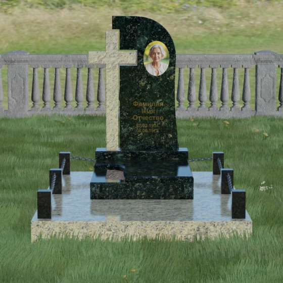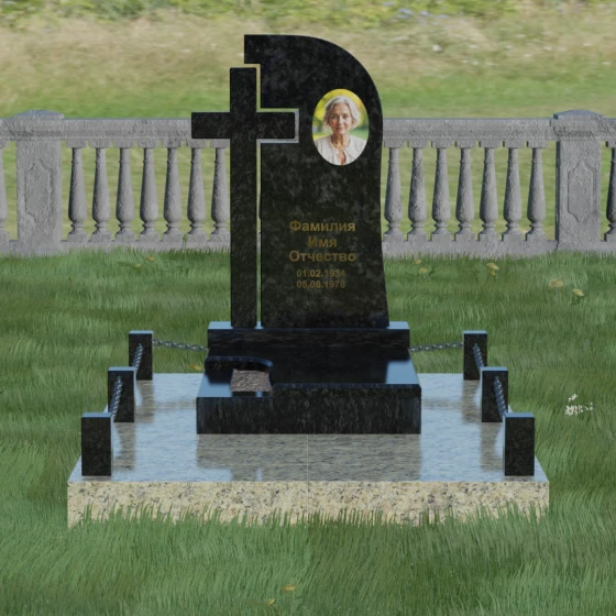 Правая часть стелы — это широкое каменное полотно с мягким, плавным изгибом в верхней части, напоминающим небесный свод или церковный купол. Контраст между прямолинейностью креста и текучестью основной плиты создает уникальный художественный ритм. Боковые грани и верхушка изделия отполированы до зеркального блеска, в котором отражается небо, в то время как глубокая гравировка текста и портрета в овальной нише подчеркивают индивидуальность монумента. Особую массивность конструкции придает основание — монумент возведен на высокий гранитный цоколь. По периметру установлены монументальные столбики с декоративными фасками, соединенные массивными цепями, что создает защищенный контур и атмосферу уединенного покоя.