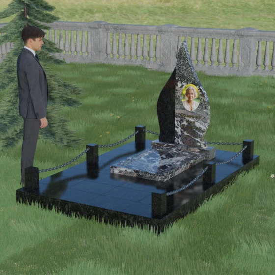 Конструкция модели 018 продумана до мелочей, включая полное благоустройство места захоронения. Монумент устанавливается на массивный двухцветный постамент, который обеспечивает устойчивость всей вертикальной конструкции. Особое внимание уделено обустройству прилегающей территории: вместо открытого грунта используется сплошное мощение плитами из натурального гранита. Это не только придает мемориальному комплексу законченный и достойный вид, но и значительно упрощает уход за ним, исключая появление сорняков и скопление грязи. Периметр участка обозначен строгим и лаконичным ограждением в виде невысоких каменных столбиков-боллардов, соединенных декоративными металлическими цепями. Такая ограда создает приватную зону, не загромождая пространство, и подчеркивает элитарность комплекса.
