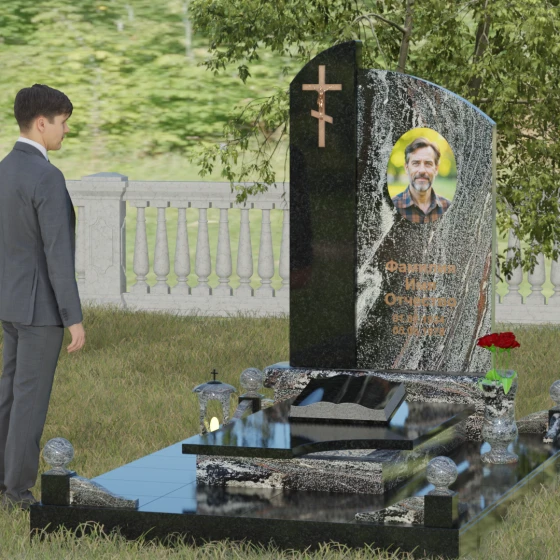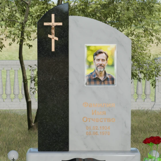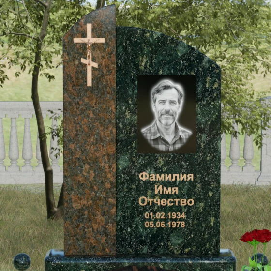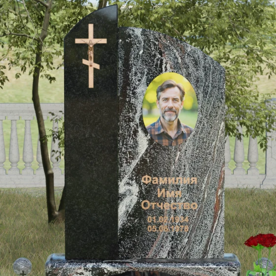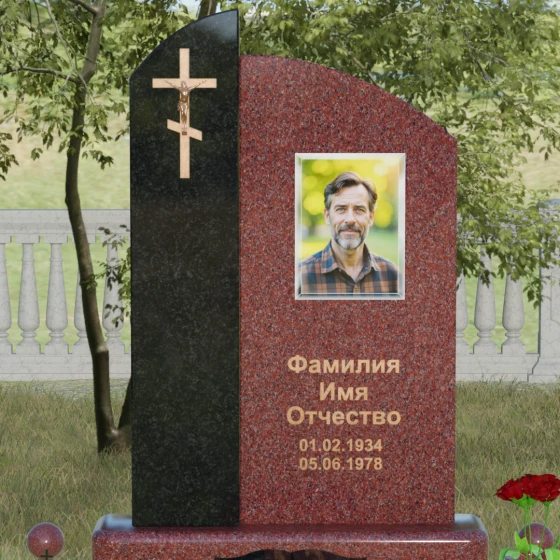 Данное ритуальное изделие представляет собой выразительную художественную композицию, построенную на гармонии двух различных фактур и форм. Выбор этой модели обусловлен её глубоким символизмом: асимметричное разделение стелы на две части олицетворяет земной и небесный пути. Левая часть, выполненная в виде строгого вертикального столпа из насыщенного цветного гранита, служит основанием для объемного православного креста с детально проработанным распятием. Правая же часть, имеющая мягкий, плавный изгиб верхней грани в форме волны, создает идеальное пространство для размещения портрета и памятных слов. Сочетание строгой геометрии и лиричного изгиба позволяет выразить всю многогранность чувств — от глубокой скорби до светлой памяти.