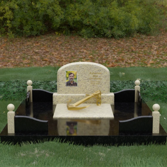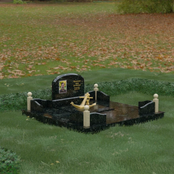 • Центральный символ: На надгробной плите расположен объемный декоративный элемент в виде золотого якоря с массивной цепью. Этот символ олицетворяет надежду, твердость характера и профессиональный путь, связанный со стихией, становясь смысловым центром всего мемориала.