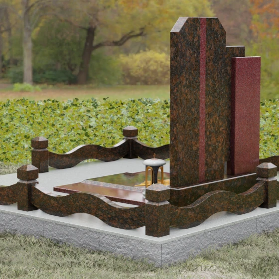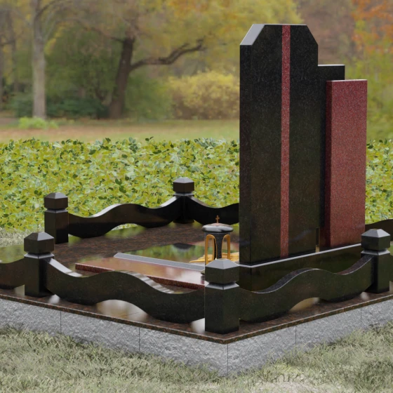Выбор мемориального комплекса — это всегда поиск баланса между строгостью формы и глубиной чувств. Модель Артикул 201 представляет собой сложную архитектурную композицию, которая идеально подходит для увековечивания памяти сильного, волевого человека, посвятившего жизнь служению. Надгробие из натурального камня состоит из трех вертикальных элементов, создающих динамичный, ступенчатый силуэт. Центральная стела, предназначенная для размещения портрета и основной информации, обрамлена боковыми пилонами из контрастного красного гранита. Такая геометрия символизирует устойчивость, надежную опору и непоколебимость духа. Сочетание строгих прямых линий и аккуратных фасок на вершинах придает памятнику торжественный, парадный вид, подчеркивая заслуги и особый статус усопшего.