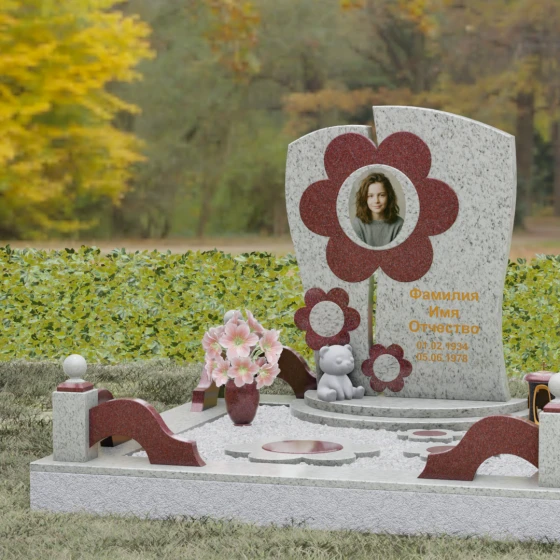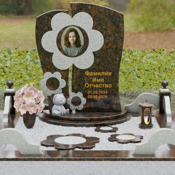 Представленный мемориальный ансамбль (Артикул 241) — это не просто памятник, а подлинное художественное произведение, в котором застыла нежность и вечная весна. В центре композиции находится величественная стела, выполненная в уникальной комбинированной технике. Ее асимметричная форма с деликатным вертикальным разделением создает динамичный и в то же время гармоничный силуэт. Главным акцентом является искусно вырезанный из камня цветок, в сердцевину которого помещен портрет. Плавные, округлые лепестки символизируют чистоту и хрупкость жизни, а их объемная фактура создает удивительную игру света и тени, контрастируя с глубокой зеркальной полировкой основного полотна стелы.