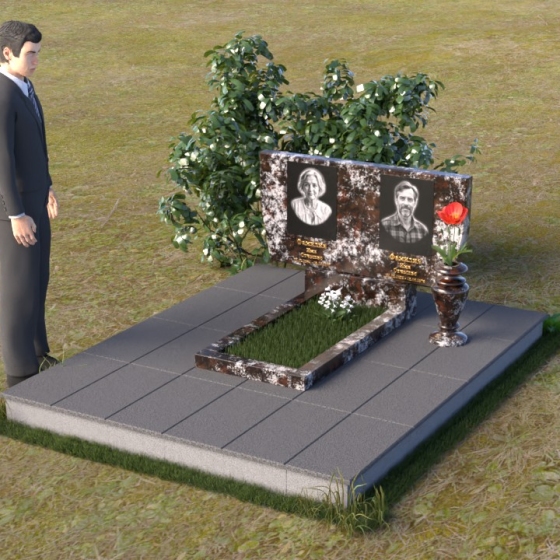 Это ритуальное изделие представляет собой гармоничное сочетание прямых линий и мягких, едва уловимых изгибов, создающих ощущение покоя и умиротворения. Стела имеет прямоугольную форму, но ее верхняя грань слегка скошена, что придает ей визуальную легкость и динамику. Обратите внимание на зеркальную полировку лицевой стороны – она отражает небо и окружающий мир, словно заключая в себе вечность. На полированной поверхности выгравированы портреты усопших и памятные надписи, выполненные с высокой точностью и детализацией. Слева от стелы, на основании, располагается небольшая горизонтальная плита с аналогичной полировкой, создающая дополнительное пространство для цветов или памятных предметов. Основание памятника выполнено из серого камня с матовой фактурой, что создает контраст с блестящей стелой и придает композиции устойчивость и завершенность. Рядом с плитой установлена ваза, выполненная из того же черного полированного гранита, что и стела, что обеспечивает единство стиля и служит достойным обрамлением для живых цветов, символизирующих вечную память.