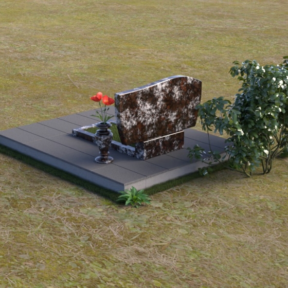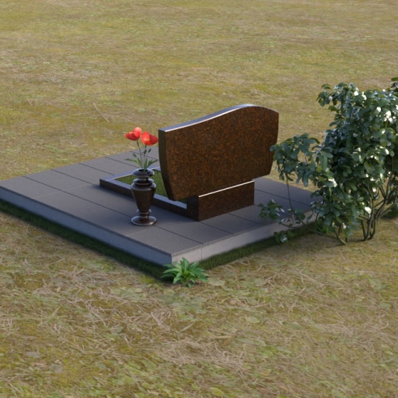 Форма стелы отличается лаконичностью, но при этом не лишена изысканности. Верхняя часть имеет мягкий, волнообразный изгиб, словно склоняясь в знак уважения и скорби. Прямоугольная подставка под стелой, выполненная в том же полированном граните, добавляет композиции завершенность и устойчивость. Дополнительная горизонтальная плита, расположенная на основании, создает пространство для возложения цветов и памятных вещей, позволяя выразить свою любовь и уважение.