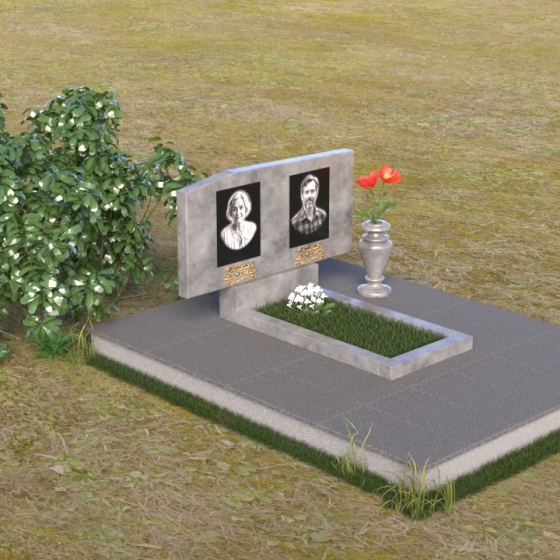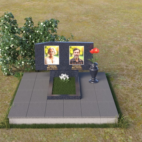 Основным элементом композиции является вертикальная плита, возвышающаяся над прямоугольным основанием. Гранитная плита имеет слегка вогнутую форму верхней грани, что придает ей мягкость и визуально облегчает массивность. На отполированной до зеркального блеска поверхности выгравированы портреты усопших, выполненные с высокой степенью детализации. Под портретами располагаются надписи с именами и датами жизни, выполненные строгим шрифтом. Вся композиция пронизана чувством сдержанности и достоинства, что позволяет сосредоточиться на главном – на памяти о тех, кого больше нет рядом.