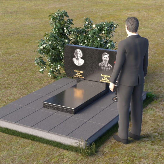 Композиция памятника строится на контрасте строгих геометрических форм и плавных линий, создавая гармоничный и запоминающийся образ. В верхней части возвышается стела из черного гранита, чья зеркальная полировка отражает небо и окружающий мир, словно напоминая о связи земного и небесного. Верхние углы стелы скруглены, смягчая строгость формы и придавая ей более мягкий, человечный облик. На стеле размещены портреты усопших, выполненные с высокой точностью и передающие их индивидуальность. Золотистые надписи имен и дат словно светятся на фоне черного камня, добавляя торжественности и значимости. У подножия стелы располагается горизонтальная плита, также выполненная из полированного черного гранита, создающая ощущение завершенности и устойчивости. Рядом – изящная ваза из того же материала, предназначенная для живых цветов, символа неувядающей памяти и любви.