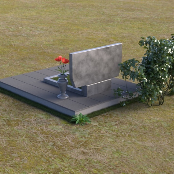 Особое внимание привлекает контраст между полированной поверхностью и матовым срезом камня на боковых гранях. Эта игра фактур создает дополнительный объем и подчеркивает геометрию монумента. Сдержанная, но выразительная форма вазы, выполненная в том же черном граните, гармонично дополняет композицию. Ее плавные линии и классические пропорции создают ощущение умиротворения и покоя.