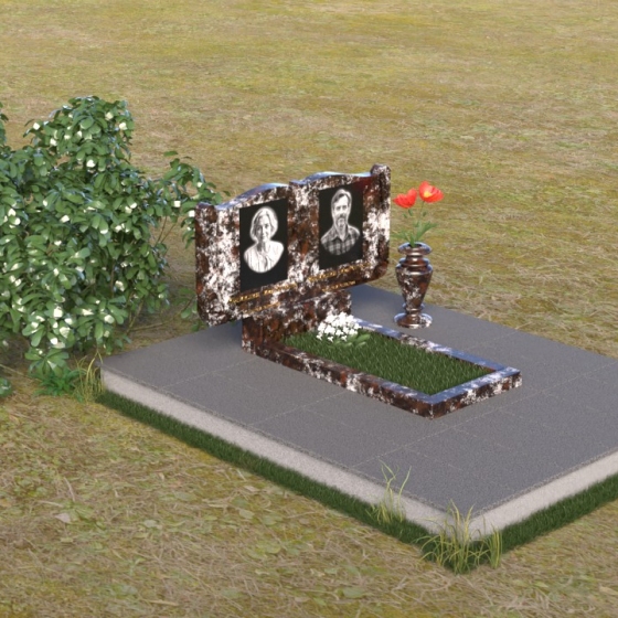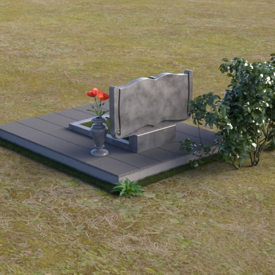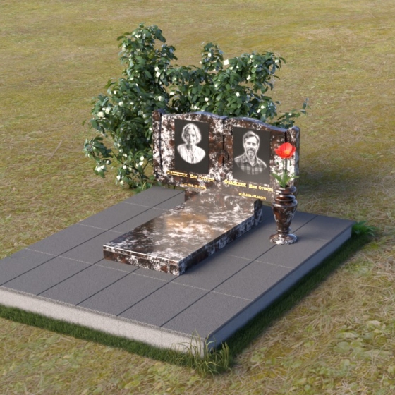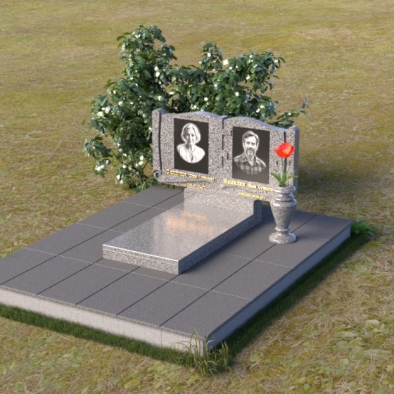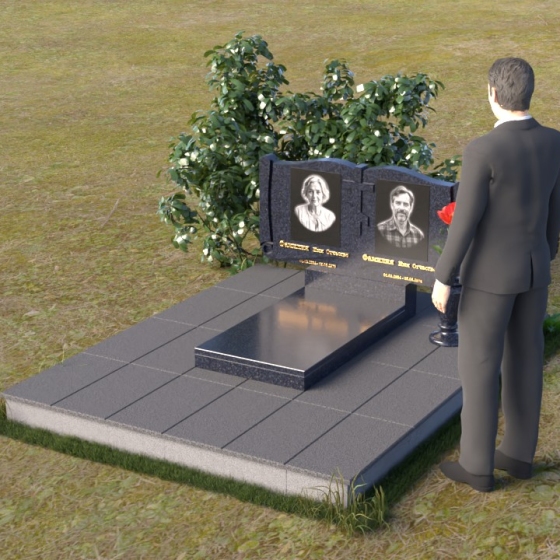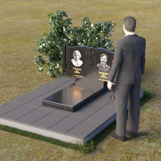 Ритуальное изделие ПГ036 представляет собой сдержанную, но исполненную достоинства композицию, созданную для сохранения памяти о близких. Два прямоугольных элемента стелы, соединенные вместе, образуют волнистый верх, напоминающий раскрытую книгу судеб. Грани обеих частей искусно обработаны, создавая мягкий, обтекаемый силуэт. Зеркальная полировка черного гранита служит идеальным фоном для гравировки портретов и надписей, словно запечатлевая светлые воспоминания в вечном камне. Слева и справа, в верхней части стелы, вырезаны лаконичные кресты, символизирующие веру и надежду. Тонкие линии врезаются в полированную поверхность, создавая игру света и тени, и добавляя глубину изображению. Горизонтальная плита, расположенная перед стелой, выполнена из того же черного гранита с зеркальной полировкой, отражая небо и окружающий пейзаж, создавая ощущение легкости и воздушности. Вместе с тем, основание памятника выполнено из серого камня, что придает всей композиции устойчивость и основательность.
