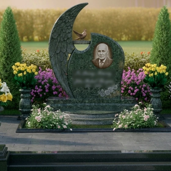 Дизайн этого гранитного монумента глубоко символичен. Форма, напоминающая ангельское крыло, олицетворяет покой, защиту и вечное упокоение души под сенью небесной благодати. Голубь, расположенный на вершине, традиционно ассоциируется с миром, надеждой и чистотой души, что делает эту композицию особенно проникновенной. Общая пластика форм, с ее плавными изгибами и мягкими линиями, создает ощущение умиротворения и безмятежности. Этот мемориал становится не просто обозначением места захоронения, а настоящим произведением искусства, выражающим глубокую любовь, уважение и стремление сохранить светлую память о человеке на долгие века.