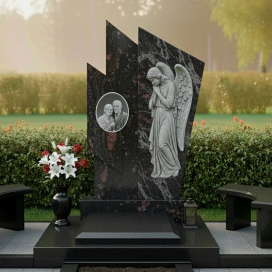Правая часть стелы представляет собой светлую, матовую плиту, которая словно обнимает темный элемент, создавая динамичный и в то же время умиротворяющий образ. Поверхность этой плиты украшена глубокой, объемной резьбой в виде склоненного ангела с распростертыми крыльями. Каждая деталь резьбы – от складок одеяния до перьев на крыльях – выполнена с невероятной точностью и трепетом, передавая ощущение покоя и скорби. Матовая фактура камня на резном изображении ангела мягко рассеивает свет, придавая фигуре эфемерность и выразительность, в то время как зеркальная полировка темного гранита отражает окружающий мир, создавая глубокий контраст и игру света.