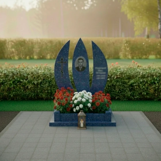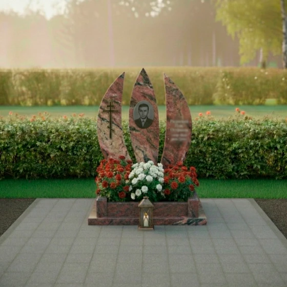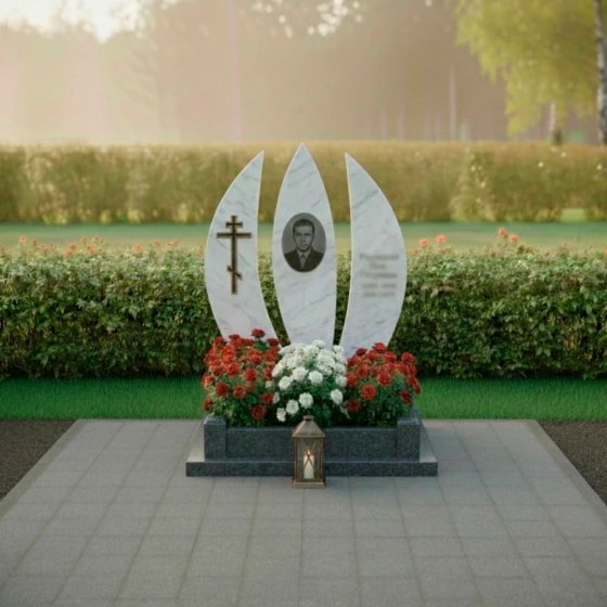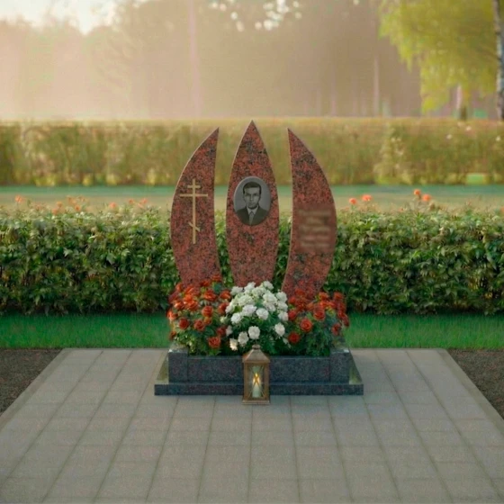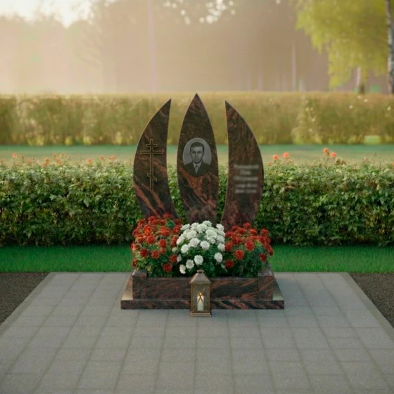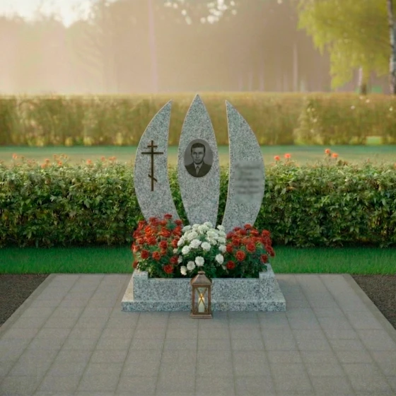 Оформление: Для столь выразительной формы стелы идеально подойдут гравированные портреты, выполненные в классическом стиле, с акцентом на глубину взгляда и благородство черт. Благодаря значительной площади каждой из трех стел, возможно размещение как крупного, детализированного портрета, так и нескольких небольших изображений. ФИО и даты жизни лучше всего располагать вертикально или по дуге, повторяя изгиб стелы, что усилит ощущение гармонии и устремленности вверх. Выбор шрифта также играет важную роль: классические, строгие шрифты подчеркнут достоинство и вечность, а более изящные — легкость и индивидуальность. Игра контрастов между полированной поверхностью и матовой гравировкой позволит выделить каждую деталь, делая текст и изображение максимально читаемыми и выразительными.