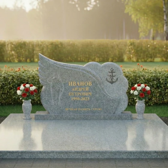 Центральная часть стелы представляет собой элегантную черную полированную поверхность, идеальную для нанесения портрета и данных усопшего. Здесь же, методом глубокой гравировки, прорисован силуэт воина, отдающего честь, что придает композиции особую торжественность и дань уважения. Правая часть стелы оформлена в виде облака с рельефным изображением якоря — символа надежды, верности и стабильности, часто ассоциирующегося с морской службой или жизненной стойкостью. Этот элемент выполнен из светлого, матового камня, создавая выразительный контраст с полированной черной основой и подчеркивая фактурное разнообразие материала.