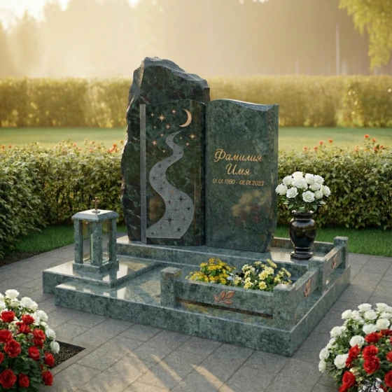 Модель ПН 196 представляет собой двухчастную композицию, где каждая стела обладает своим неповторимым характером. Левая стела, выполненная в виде необработанной скалы, символизирует вечность и незыблемость. Её фактурная поверхность, лишенная зеркальной полировки, создает ощущение первозданной мощи природы. На этой стеле, словно высеченная самой природой, изображена гравировка, стилизованная под ночное небо с извивающейся рекой звезд. Полумесяц и россыпь мерцающих звезд, выполненные с удивительной детализацией, создают эффект глубины и космического спокойствия, а светлая матовая фактура рисунка контрастирует с темным, почти черным полированным фоном, придавая изображению объем и выразительность. Звездная река, плавно уходящая вверх, символизирует путь души к небесам, а звезды напоминают о ярких моментах жизни.