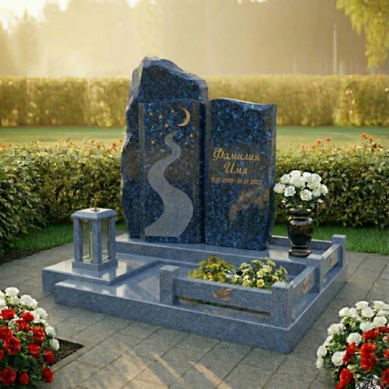 Монумент установлен на массивный, многоуровневый гранитный цоколь, который не только придает всей конструкции исключительную устойчивость, но и формирует завершенную архитектурную композицию. Нижний уровень цоколя имеет широкую, полированную поверхность, создающую ощущение надежности и прочности. Следующий уровень, чуть более узкий, создает эффект ступеней, ведущих к самим стелам. Надгробная плита, выполненная в едином стиле с цоколем и стелами, закрывает всю площадь захоронения, что не только придает участку ухоженный и законченный вид, но и значительно упрощает уход за ним, избавляя от необходимости прополки и поддержания чистоты. По периметру надгробной плиты расположены изящные бортики, образующие две прямоугольные клумбы, предназначенные для живых цветов. В них уже высажены яркие композиции, символизирующие жизнь и память. Дополнительно, в композицию включены элегантная гранитная ваза для цветов, выполненная в той же зеркальной полировке, что и правая стела, и изящный каменный подсвечник-фонарь, который позволяет разместить лампадку, создавая атмосферу уюта и вечной памяти.
