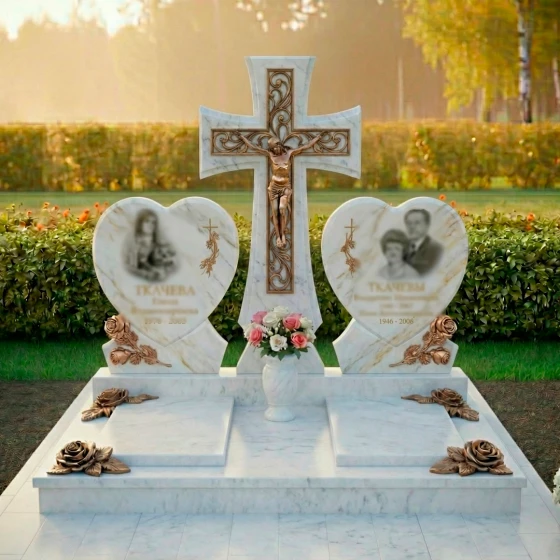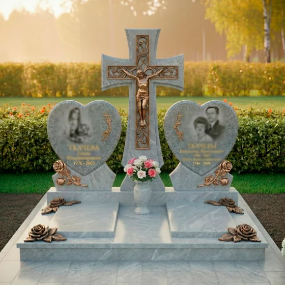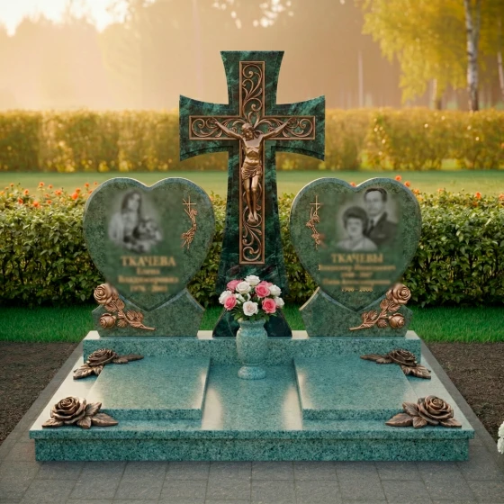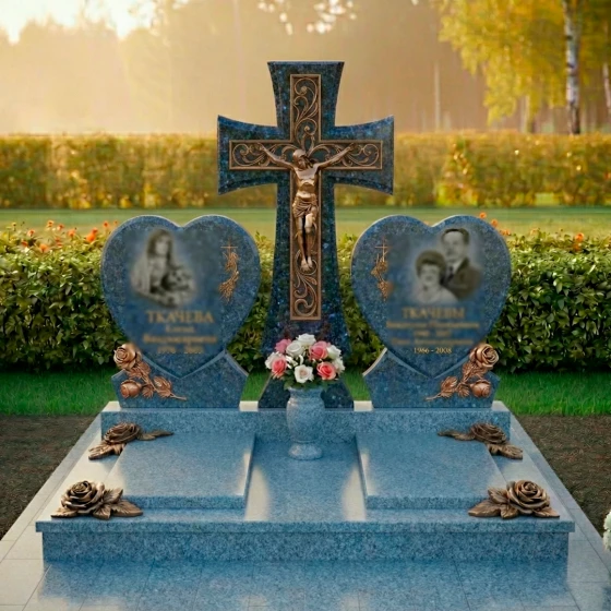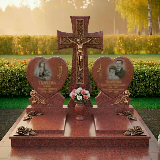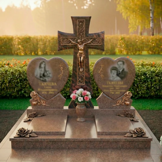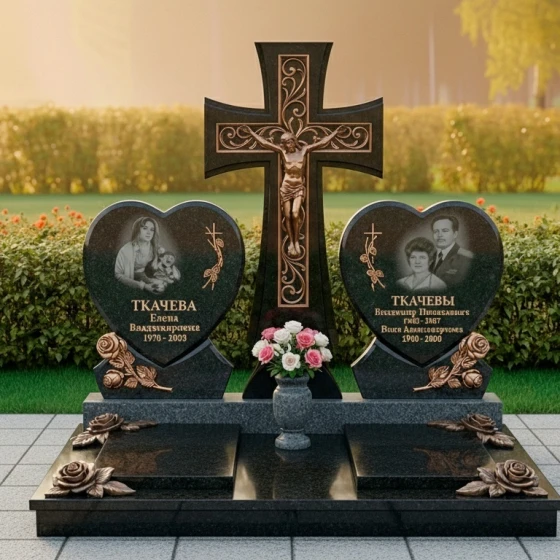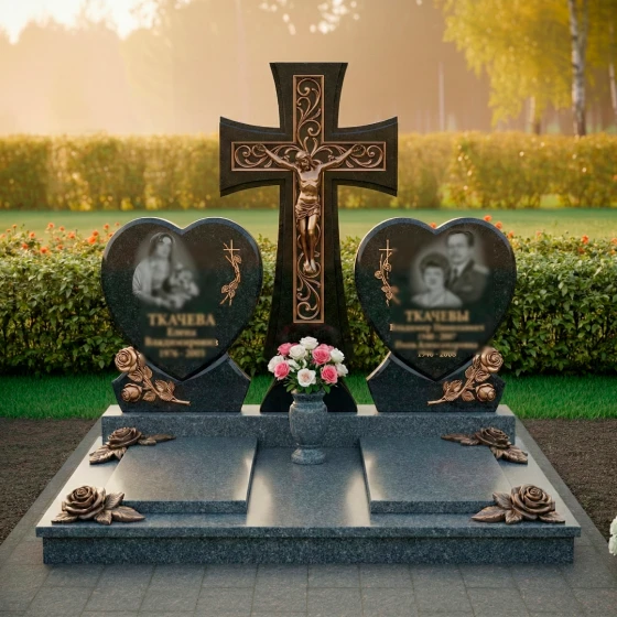 Форма этого монумента глубоко символична. Центральный крест олицетворяет веру, надежду и вечную жизнь, являясь незыблемым столпом духовности. Две мемориальные плиты в форме сердец, расположенные по обе стороны, символизируют неразрывную связь двух любящих душ, их единение даже после расставания. Розы, украшающие основания сердец, традиционно ассоциируются с любовью, красотой и недолговечностью жизни, но в данном контексте они обретают новое значение — вечной памяти и неувядающей привязанности. Композиция в целом излучает покой и защиту, создавая ощущение умиротворения и вечного пристанища. Это не просто камень, это хранитель воспоминаний, оберегающий светлый образ ушедших от забвения, дарящий утешение и надежду на вечное воссоединение.