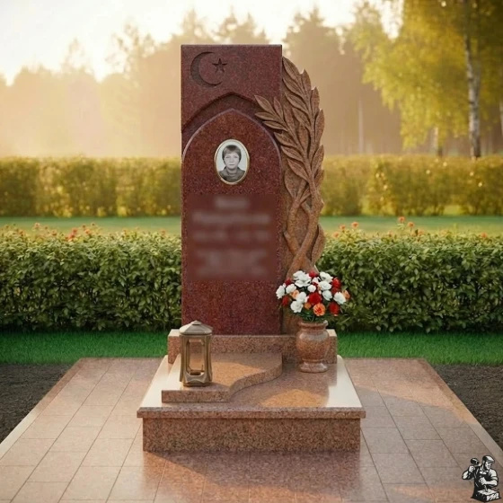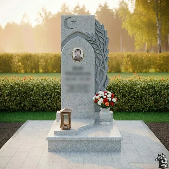 Центральная стела, выполненная в форме вертикального прямоугольника с выразительными асимметричными элементами, сразу привлекает внимание. Ее левая грань обработана с идеальной полировкой, создавая зеркальную поверхность, в которой отражается окружающий мир, символизируя бесконечность бытия. В верхней части стелы расположен изящный полумесяц со звездой, вырезанный с особой тщательностью, что придает памятнику глубокий религиозный смысл и подчеркивает индивидуальность усопшего. Ниже этого символа, в углублении, напоминающем стрельчатую арку, помещена овальная фотокерамика с портретом, обрамленная тонким рельефным кантом, что придает изображению особую значимость и защищенность.