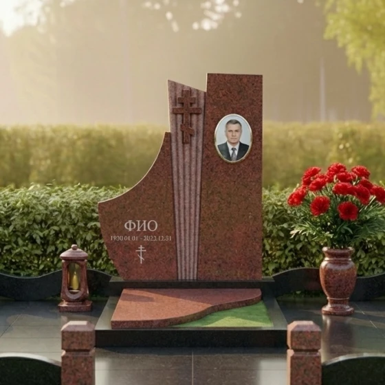 Особое внимание уделено благоустройству места захоронения. Ритуальное изделие установлено на массивный гранитный цоколь, который не только обеспечивает исключительную устойчивость конструкции, но и четко очерчивает границы участка. Цоколь имеет полированную поверхность, что придает ему благородный вид и облегчает уход. Внутри цоколя, вместо традиционной земли, уложена надгробная плита, выполненная в едином стиле со стелой. Это создает законченный, цельный образ всего мемориального комплекса и значительно упрощает уход за местом захоронения, избавляя от необходимости регулярной прополки и поддержания порядка. В левой части надгробной плиты предусмотрено небольшое углубление, в котором установлена лаконичная лампада, предназначенная для зажжения свечи в память об ушедшем. Рядом с лампадой, в правой части, расположена изящная каменная ваза, наполненная алыми розами, которые символизируют глубокую любовь и уважение. Периметр участка обрамлен элегантным каменным ограждением с плавными изгибами и невысокими резными столбиками, которые придают всей композиции завершенный и утонченный вид, создавая атмосферу уединения и покоя.