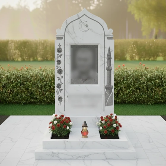 Особое внимание стоит уделить художественной резьбе, которая создает великолепный контраст с основной зеркальной поверхностью. На левой стороне фасада расположена вертикальная гирлянда из пяти распускающихся роз. Мастера детально проработали каждый лепесток: вы можете увидеть объемные изгибы бутонов и тонкие линии стеблей, которые словно оживают на холодном камне. Правая сторона украшена изображением стройного минарета — символа веры и стремления души ввысь. Венчают композицию искусно выгравированные полумесяц и звезда, выполненные в технике глубокой матовой гравировки, которая остается четкой даже спустя десятилетия под открытым небом.