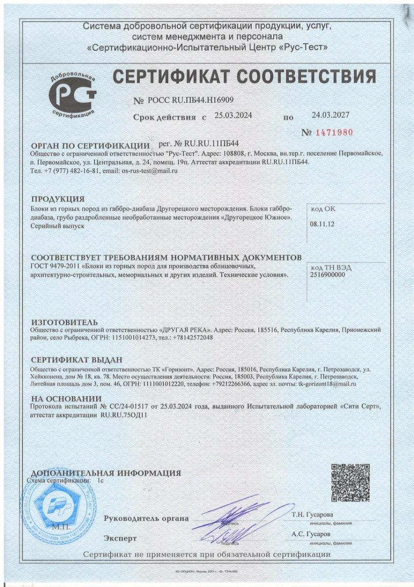 Мы хотим, чтобы вы были абсолютно уверены в качестве и безопасности материала, из которого будет изготовлен памятник для ваших близких. Поэтому мы публикуем сертификаты соответствия на основные виды гранита, которые мы используем в работе.